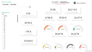 Le baromètre du CNEC-AG2R vous permet de vérifier, de comparer l’activité, le CA de votre/vos salon/s par rapport à la mienne ders salons de votre région, de l’ensemble de la France, en fonction également de la période et de l’année.