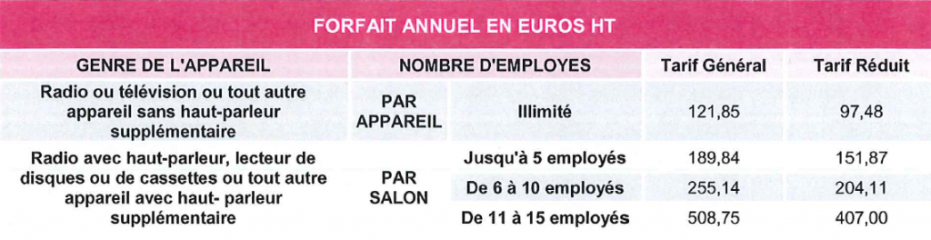 Le montant de ces droits d’auteur est fonction du mode de sonorisation et du nombre de personnes travaillant dans votre salon.